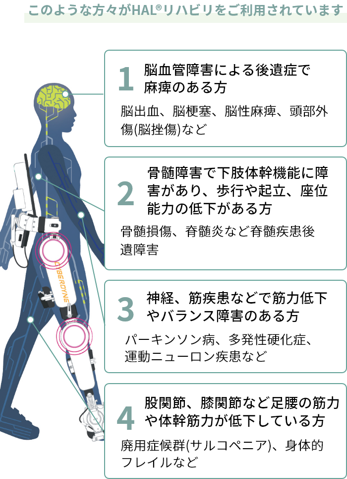 もともと神経難病(ALSや筋ジストロフィーなど)のリハビリに用いられてきましたが、歩行障害のある様々な疾患の方に有効であることがわかってきています。当院では自立支援下肢タイプのHALを用いて医療保険でのリハビリテーションを行っております。